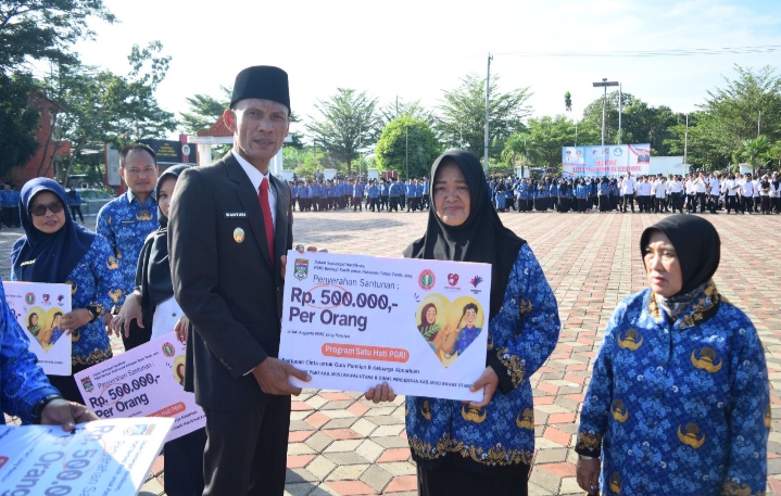 Dalam rangkaian upacara tersebut, Wakil Bupati juga secara simbolis menyerahkan santunan kepada ahli waris guru yang telah wafat melalui organisasi Persatuan Guru Republik Indonesia (PGRI). Total ada 39 orang ahli waris guru yang menerima santunan tersebut sebagai bentuk penghargaan atas jasa dan dedikasi para pendidik.