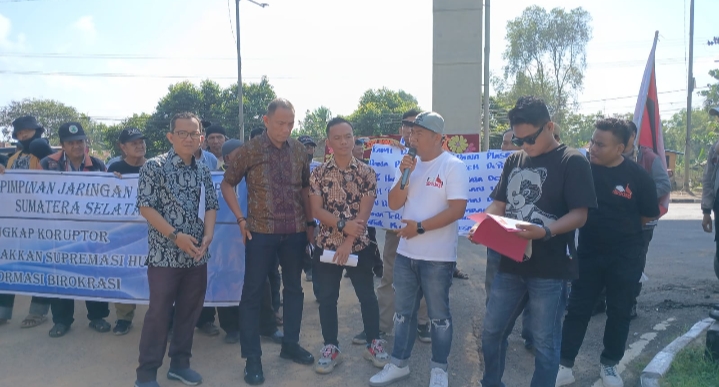 PALEMBANG I STARINTI.COM – Puluhan massa yang tergabung dalam Jaringan Anti Korupsi Sumatera Selatan (Jakor Sumsel) menggelar aksi demonstrasi di depan kantor Kejaksaan Tinggi (Kejati) Sumatera Selatan, Jumat (18/7/2025). Aksi tersebut menjadi langkah awal Jakor Sumsel dalam menyoroti dugaan praktik korupsi dan penyalahgunaan kekuasaan di tingkat desa yang dinilai telah melukai rasa keadilan masyarakat.