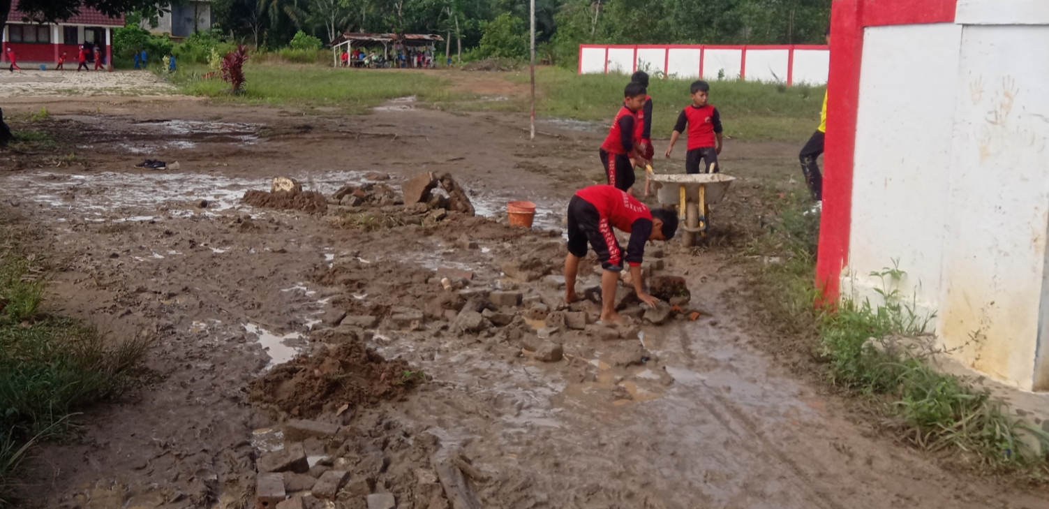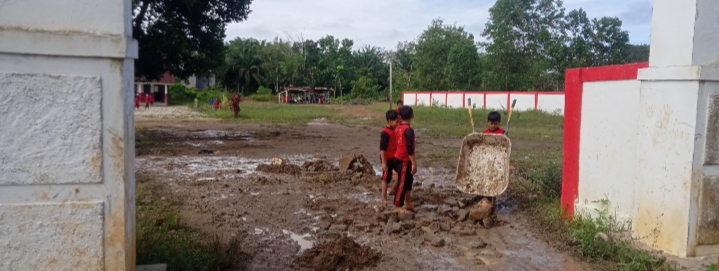 Pantauan di lokasi sekolah terlihat para siswa sibuk disuruh kerja bakti membawa pecahan batu pakai gerobak sorong. “Ayo timbun lagi.”kata salah satu guru saat memerintahkan para siswa tersebut, belum lama ini.
